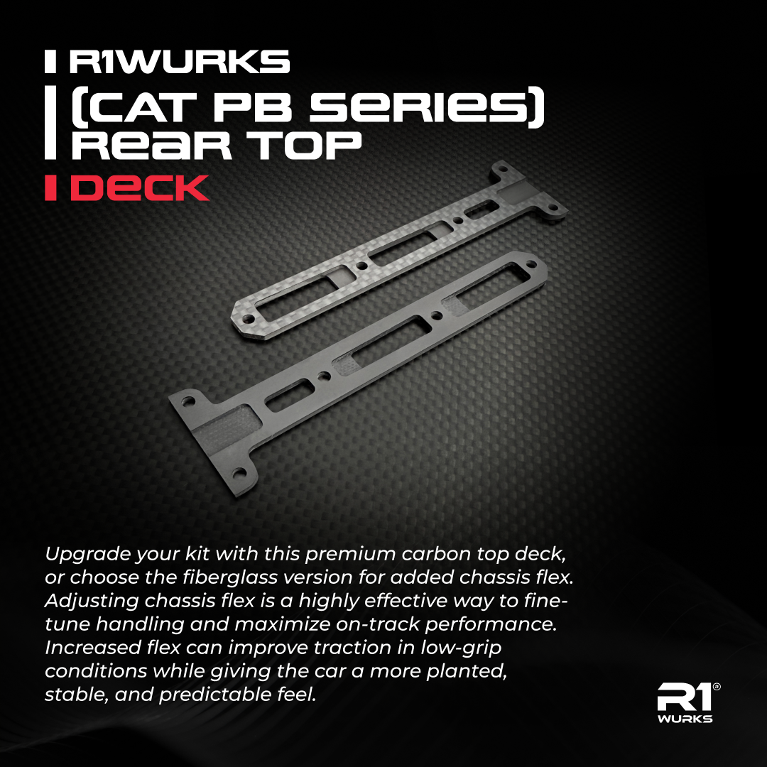 Upgrade your kit with this premium carbon top deck, or choose the fiberglass version for added chassis flex. Adjusting chassis flex is a highly effective way to fine-tune handling and maximize on-track performance. Increased flex can improve traction in low-grip conditions while giving the car a more planted, stable, and predictable feel.