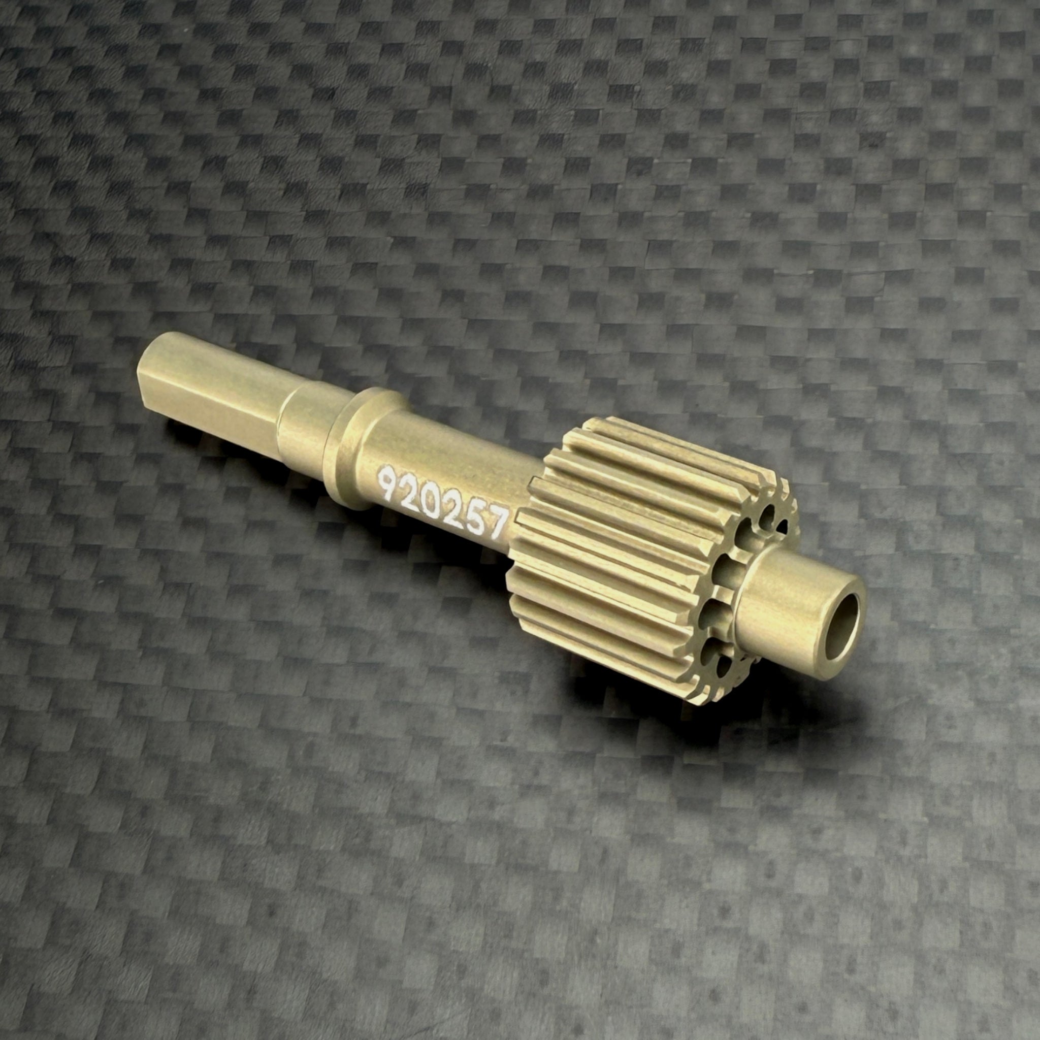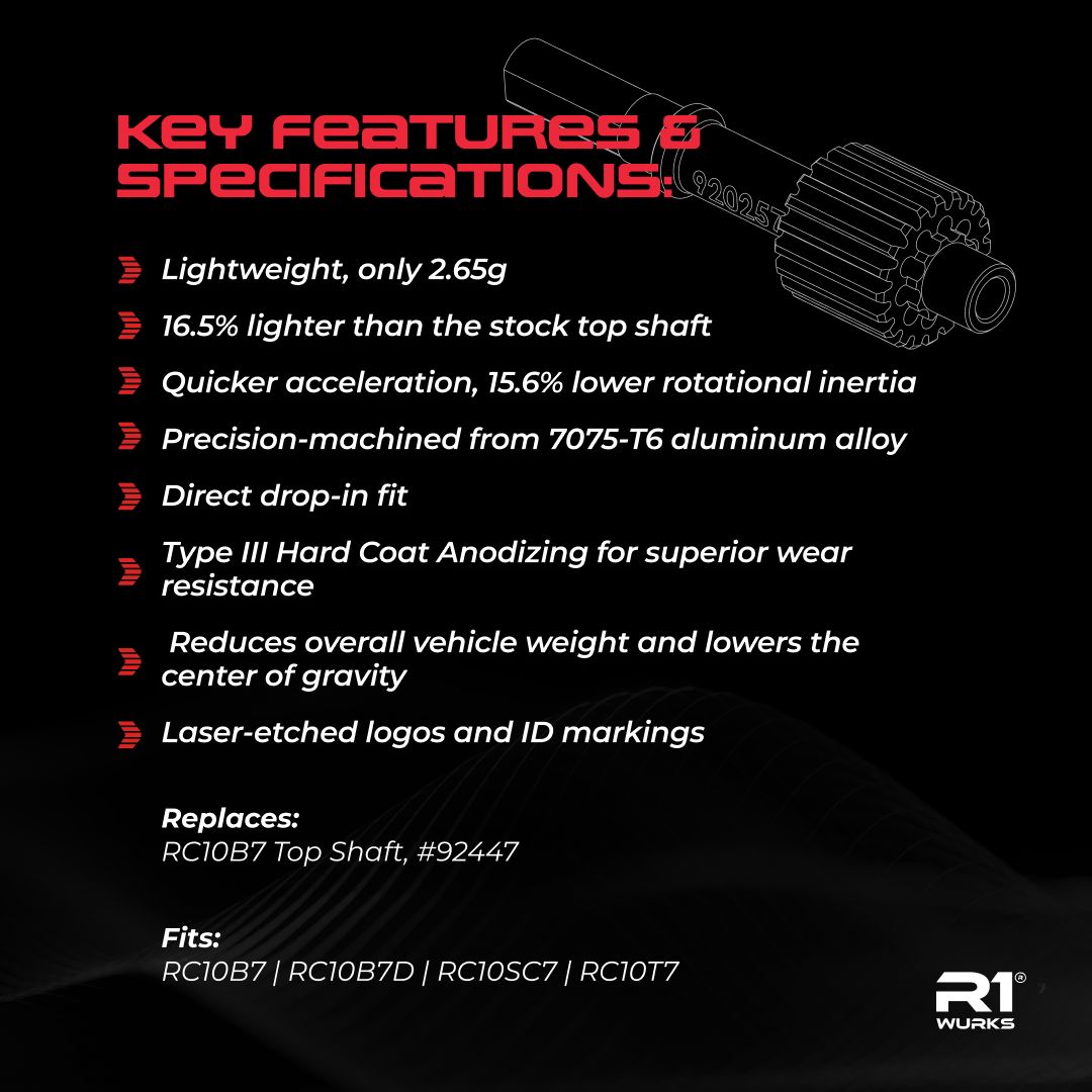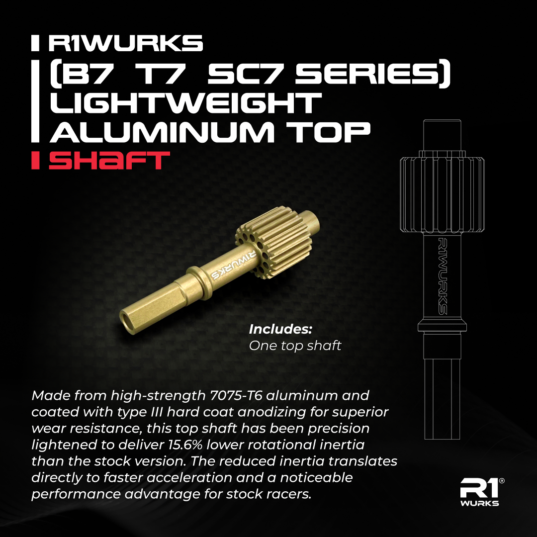 Made from high-strength 7075-T6 aluminum and coated with type III hard coat anodizing for superior wear resistance, this top shaft has been precision lightened to deliver 15.6% lower rotational inertia than the stock version. The reduced inertia translates directly to faster acceleration and a noticeable performance advantage for stock racers.