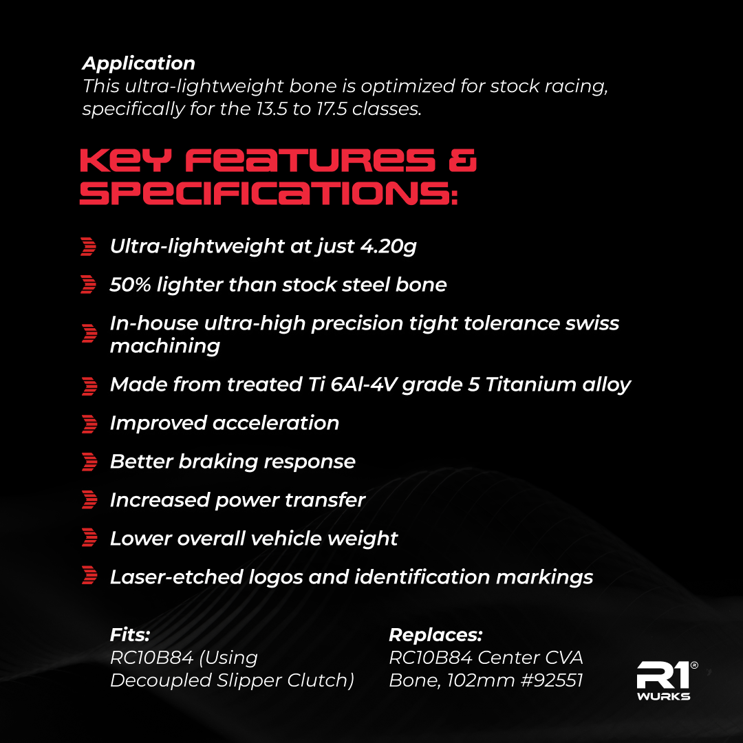 This bone is made from specially treated Ti 6Al-4V grade 5 titanium alloy, these parts offer exceptional strength and a substantial reduction in rotational inertia. It provides quick acceleration and deceleration, giving stock racers a crucial competitive advantage.